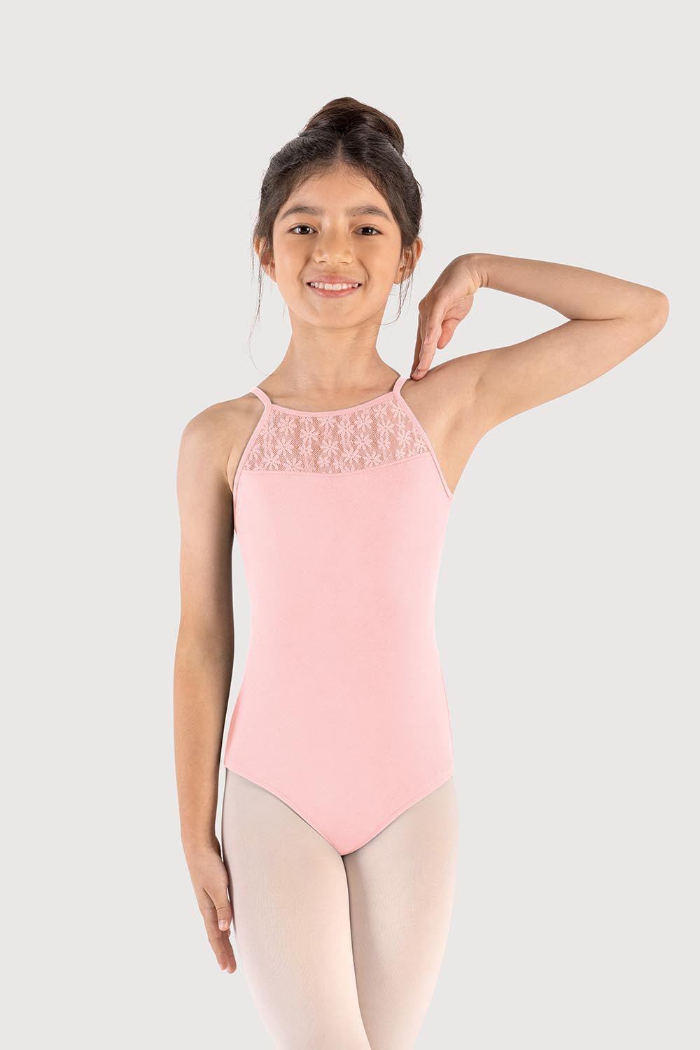 This elegant halterneck leotard features a high neckline framed with delicate daisy lace, adding a touch of charm to every performance. The lace continues through to the back, surrounding a keyhole cut-out for style and breathability. Finished with a secure clasp at the nape, it’s a comfortable, easy-to-wear piece your young dancer will love.