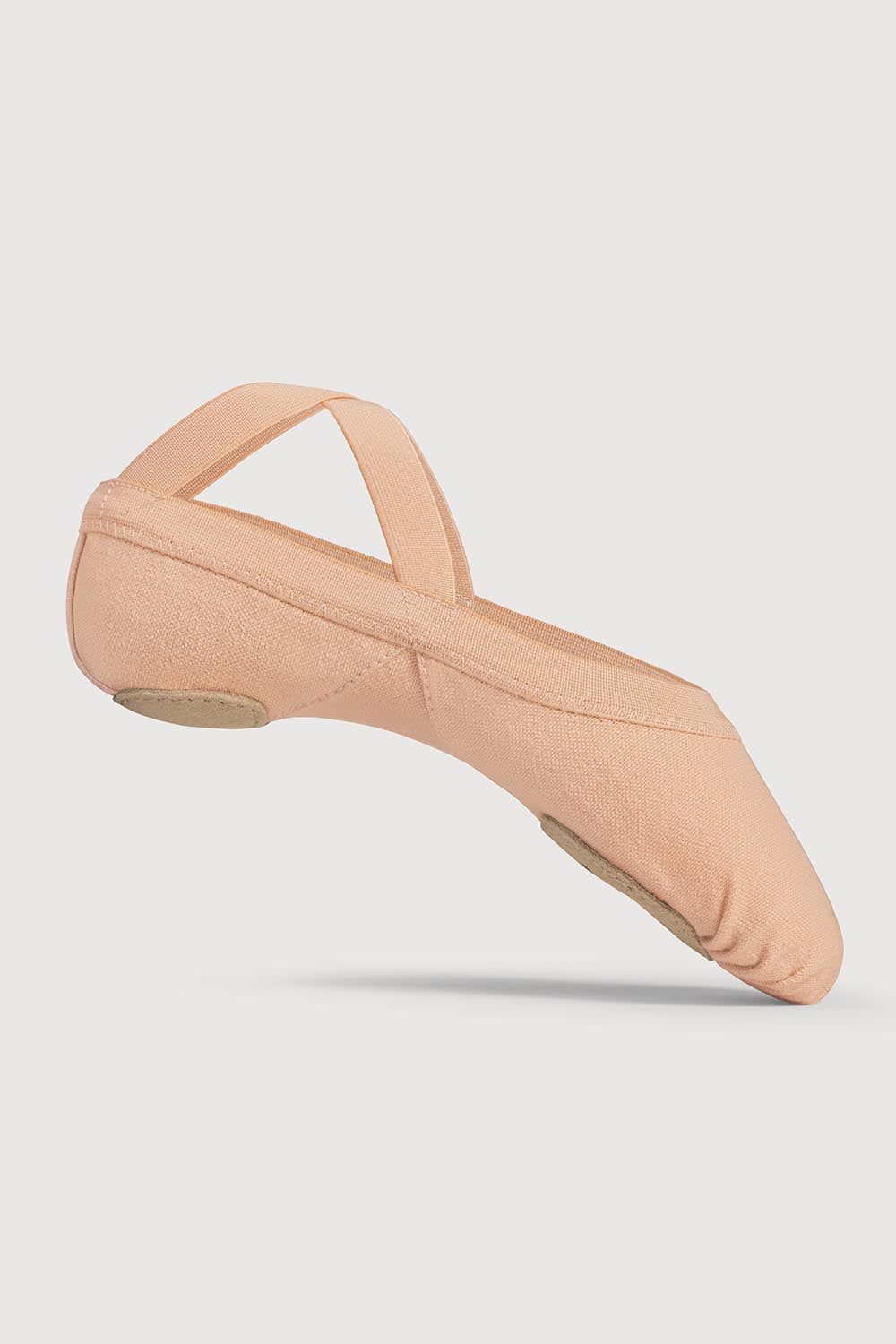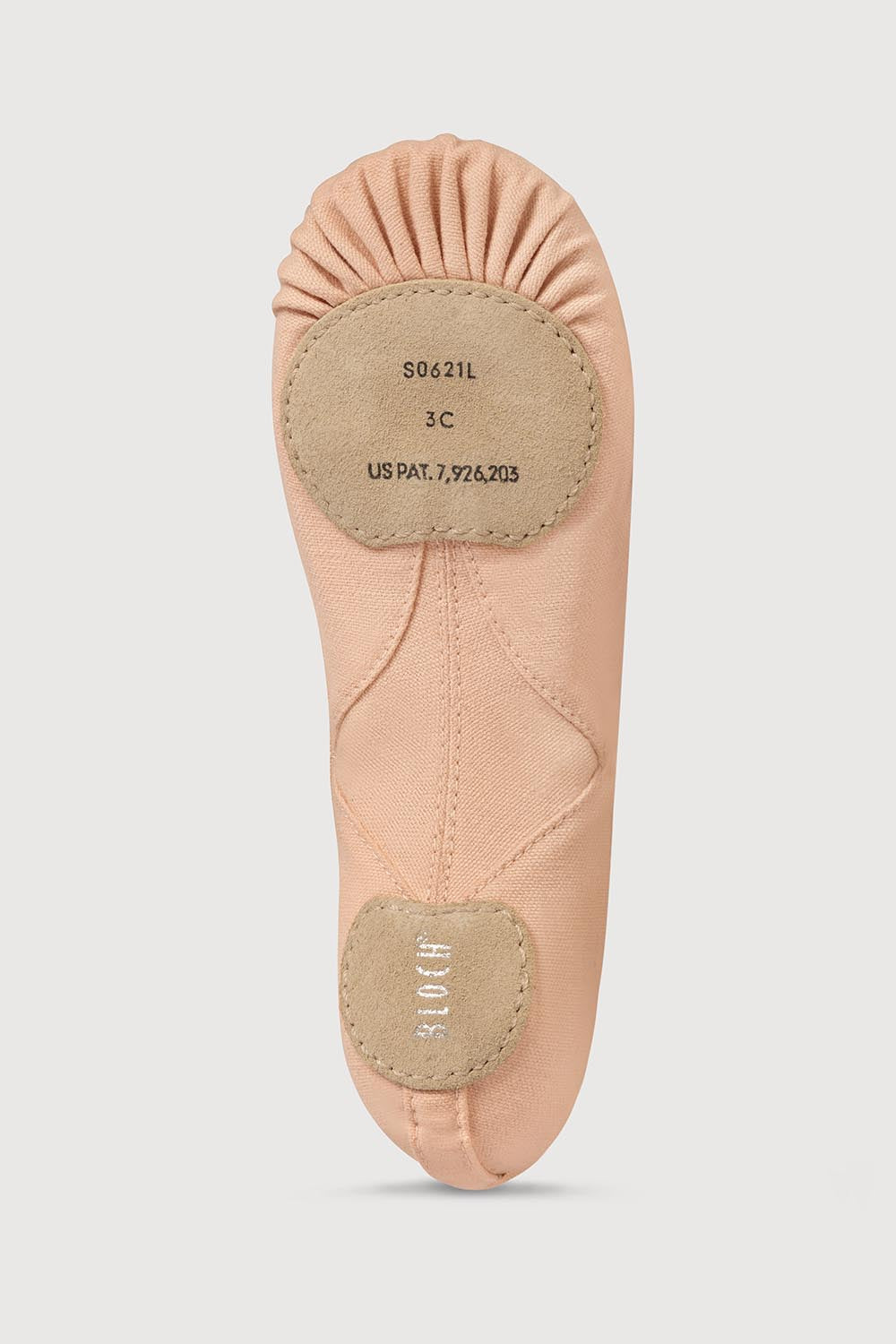 The Synchrony is an innovative design on a split sole ballet flat, developed for interdisciplinary work - lyrical, ballet and gymnastics. The stretch and durable canvas molds to the shape of the foot to ensure a sleek and streamline fit. In place of the binding and cord, the ballet upper has flat elastic that reduces pressure on the Achilles tendon and dorsal surface of the foot on contact with the floor. This eliminates bruising from pressure where the drawstring would otherwise be knotted. For extra stability inside the shoe is a unique inner design of silicone dots on the front and heel pads which maintain the contact grip between the foot and shoe creating a firm marriage between the two. The wide kidney shaped suede outsole front pad shoe allows a wider spread for extra metatarsal comfort and the modified curved heel shape reflects the contour of the heel when pointing. Pre-sewn criss-cross elastic means no sewing is required so the shoes are ready to wear immediately.