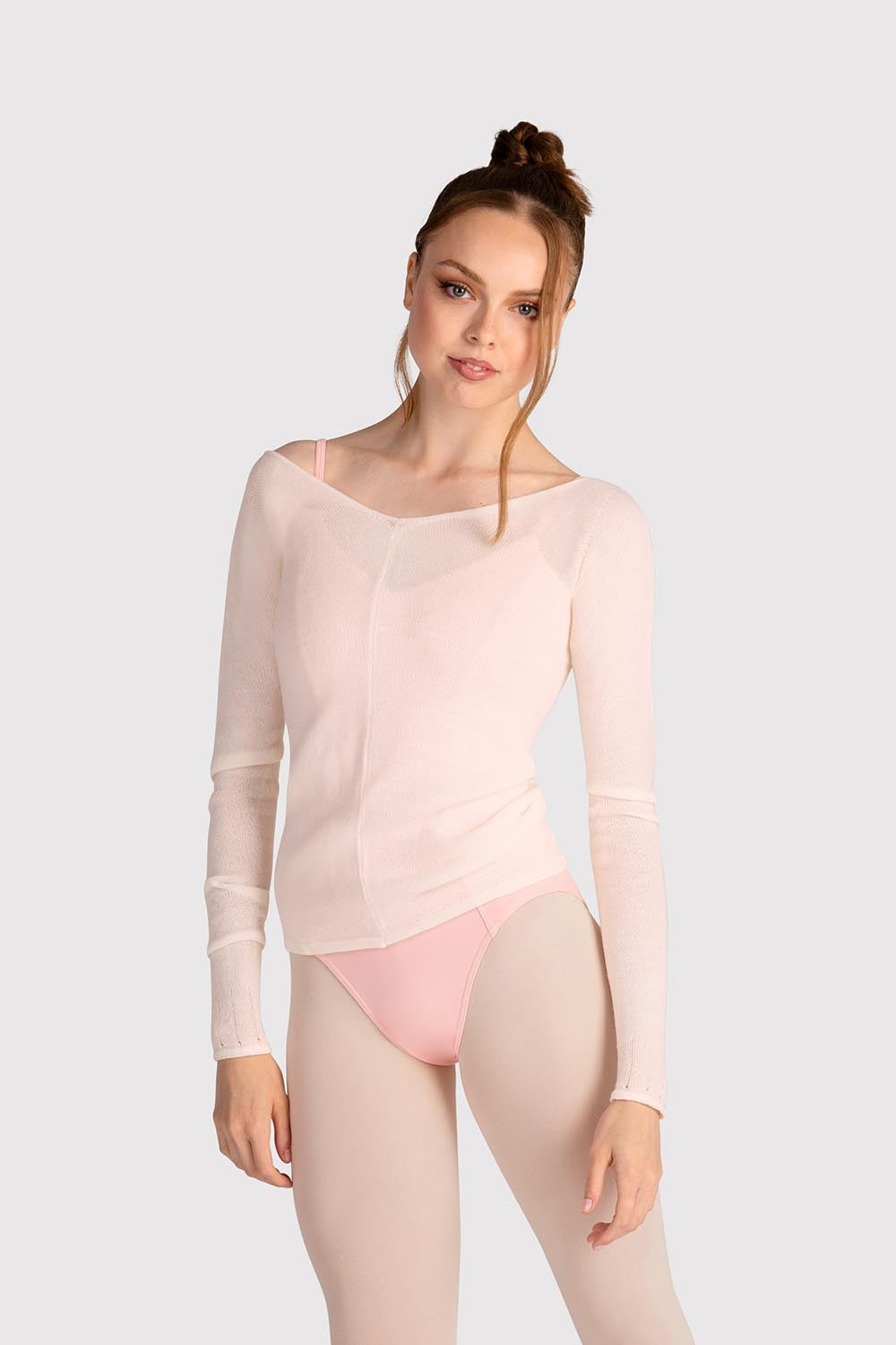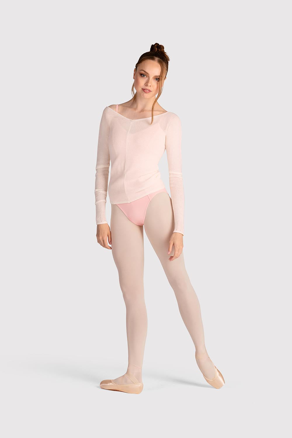 Classical lightweight warm up top for dancers with an open neckline and centre front seam retains important muscle warmth for the upper body. The slip stitch design at the cuff adds an extra fashion detail.