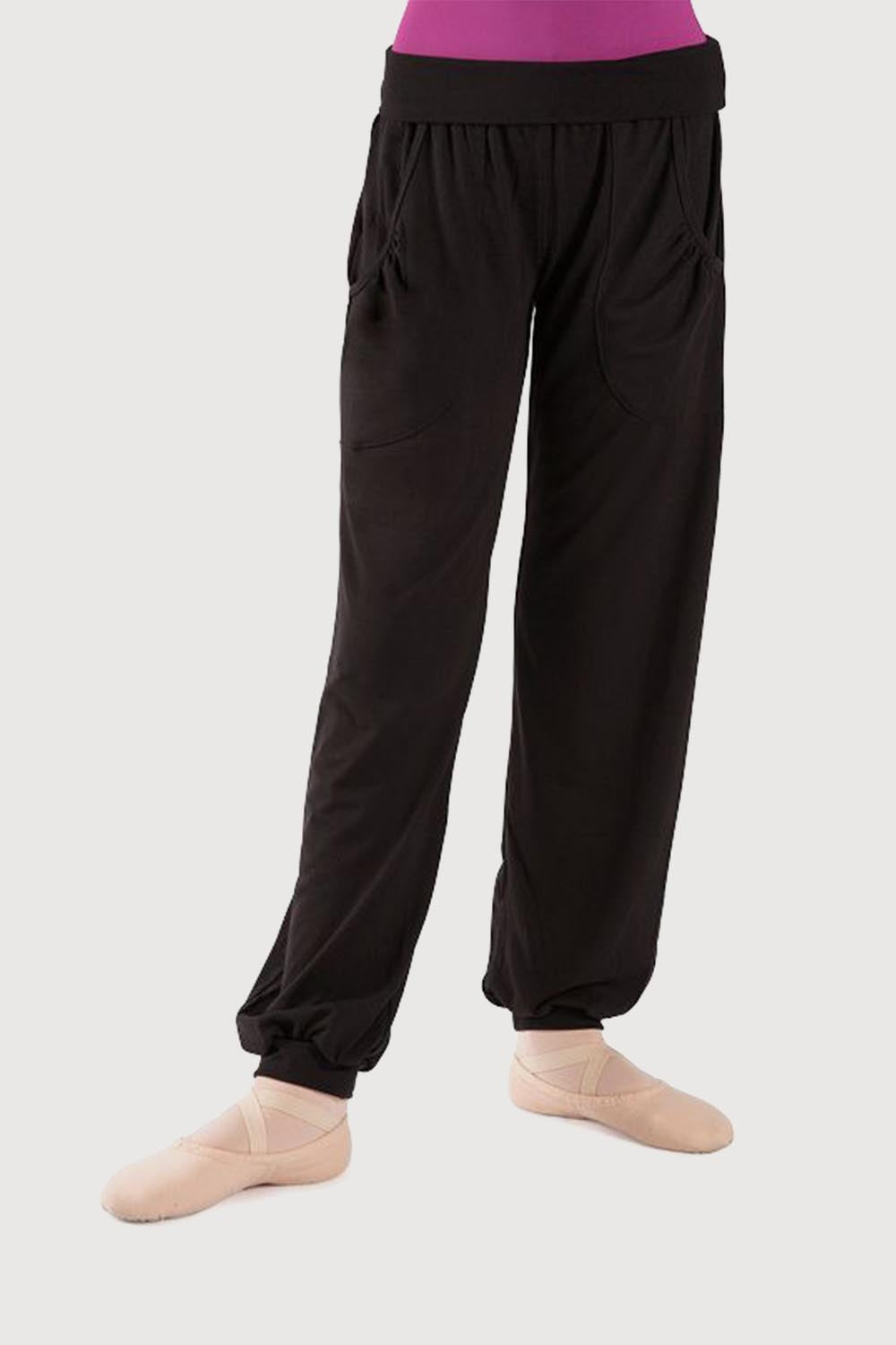 A full-length pant with bottom cuff detail has a wide waistband that can be folded down or worn higher on the tummy. The Harem style of the pant gives a slim lose fit with draped front pockets and small back pockets which are both functional.