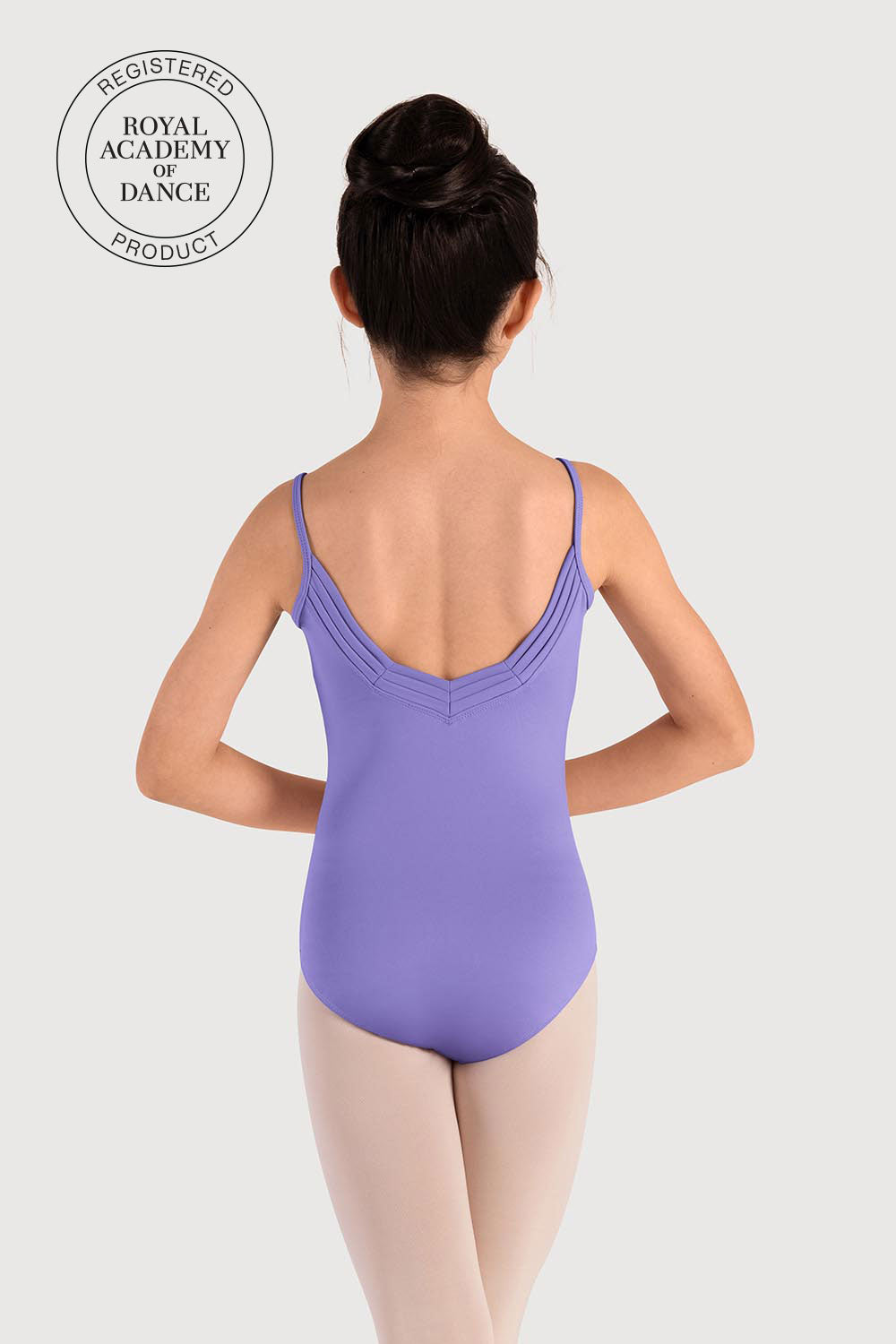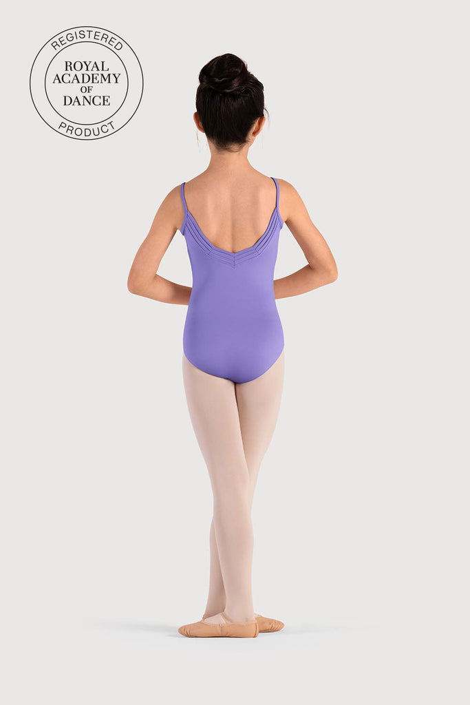 A cami strap style leotard with shaped princess line front seams. The front V neckline features a three pleat design which continues in a pentagon shaped back. The standard legline flatters all body shapes and the front is lined for modesty and comfort.