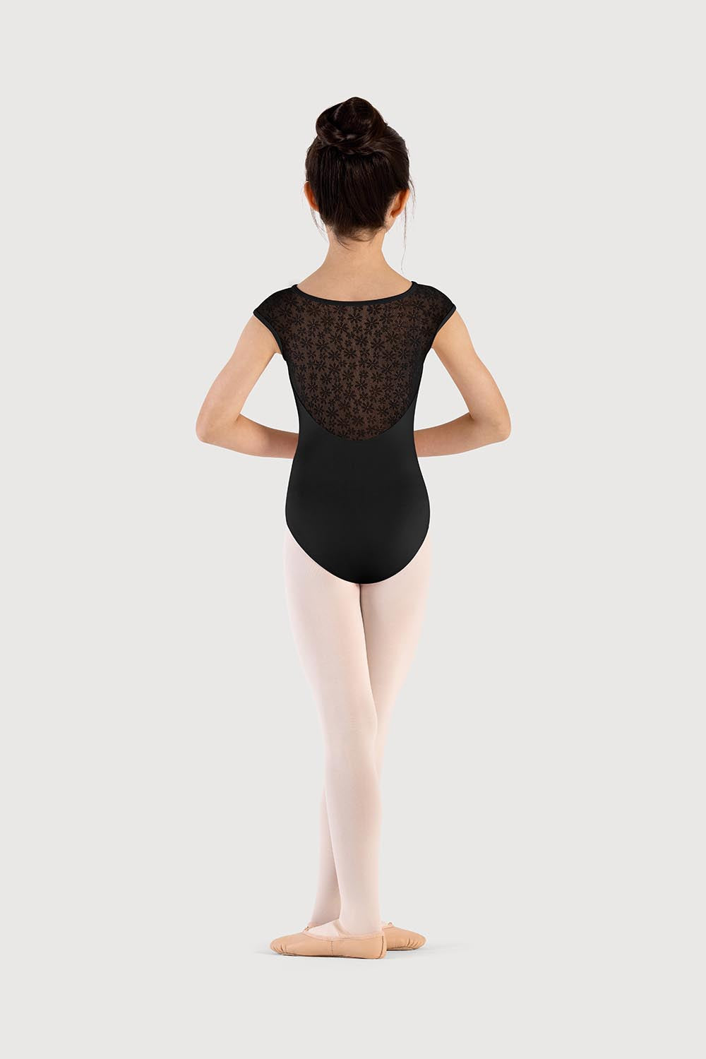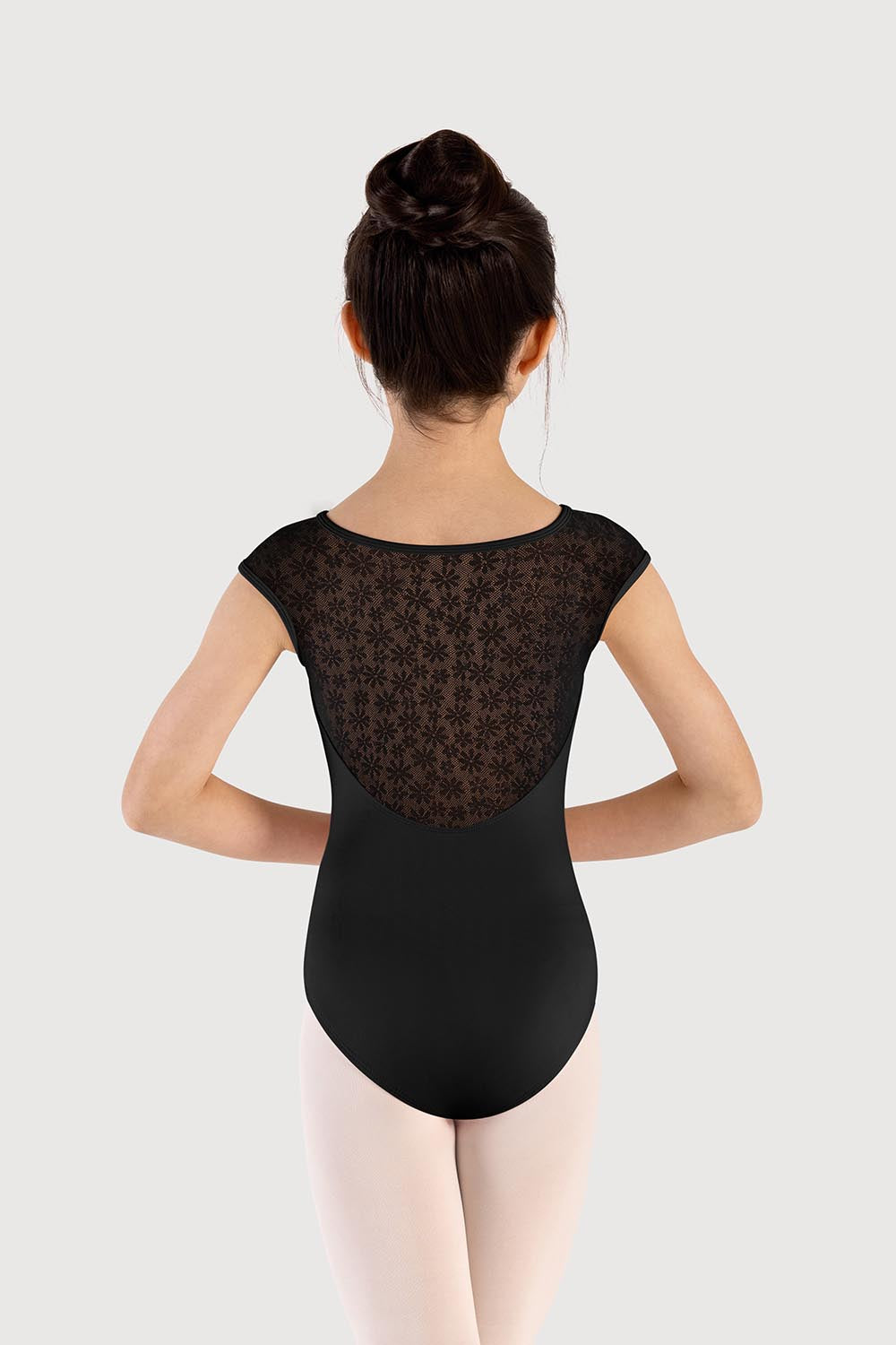 Perfect for class or recital, this cap sleeve leotard pairs a sweetheart neckline with a softly gathered bust for a graceful finish. Delicate daisy lace sleeves and back add texture and charm, making it a piece your young dancer will love to wear.
