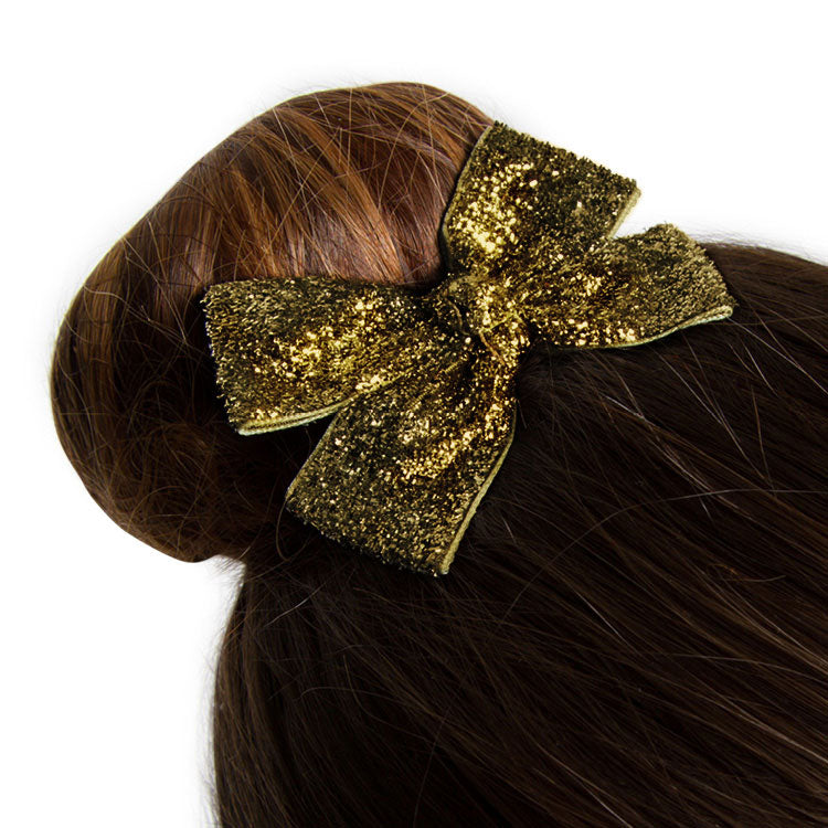 This funky hair accessory features a double glitter bow on an easy to open clip which allows you to slide the bow into the hair and fasten with ease. The bow measures to approximately 7.5cm and looks stunning above a pony tail or a bun. Available in an array of bright and beautiful colours, the perfect addition for any outfit for dance or gymnastics.