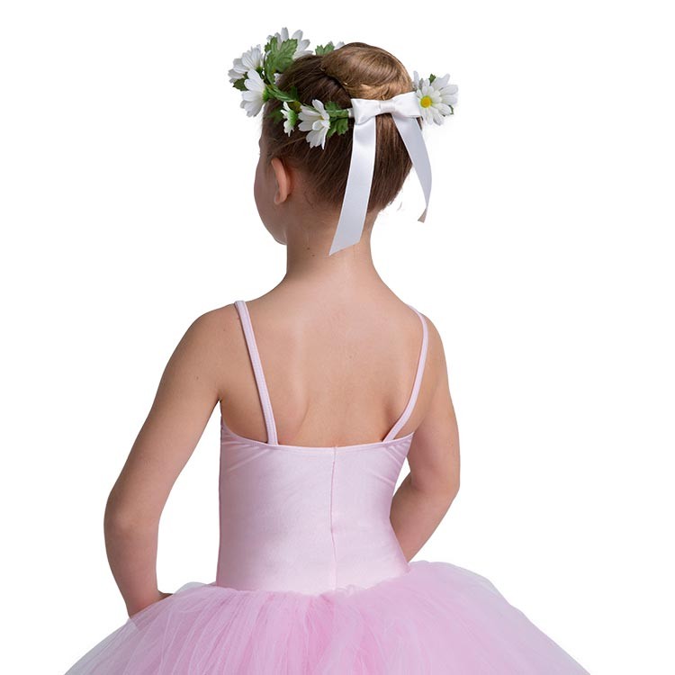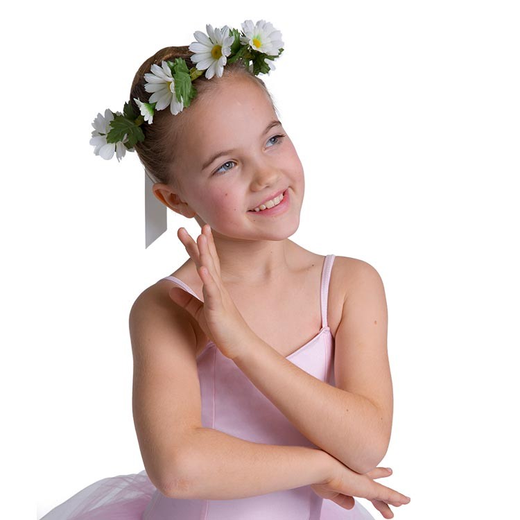 This flower wreath halo of a dozen white daisy flowers is reminiscent of the Pas de Quatre divertissement of the The Romantic Era. Finished with a white satin bow at the back this halo will enhance any classical costume.