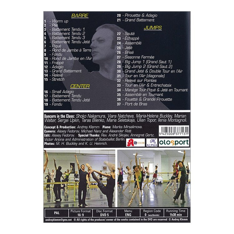 Andrey Klemm presents a professional level ballet master class which runs over the duration of 98 minutes. This DVD is rich in content, capturing and demonstrating the technique, musicality and artistry that is required to accomplish the detailed ballet routines set at the bar which progresses through to center work and jumps.