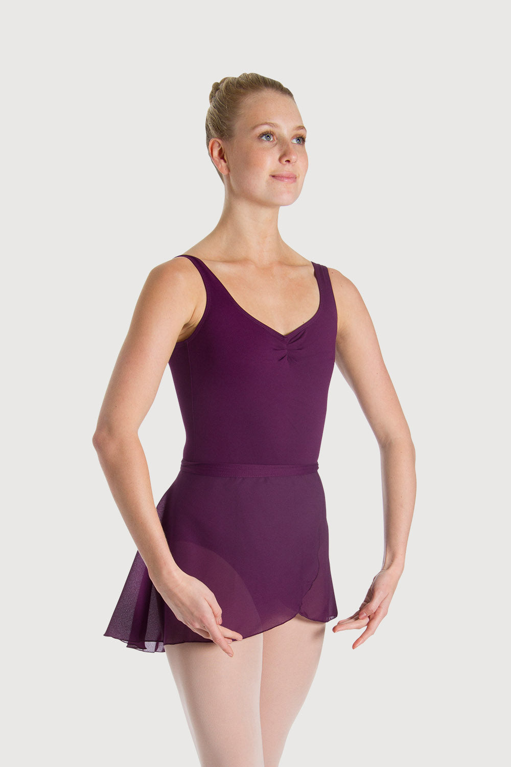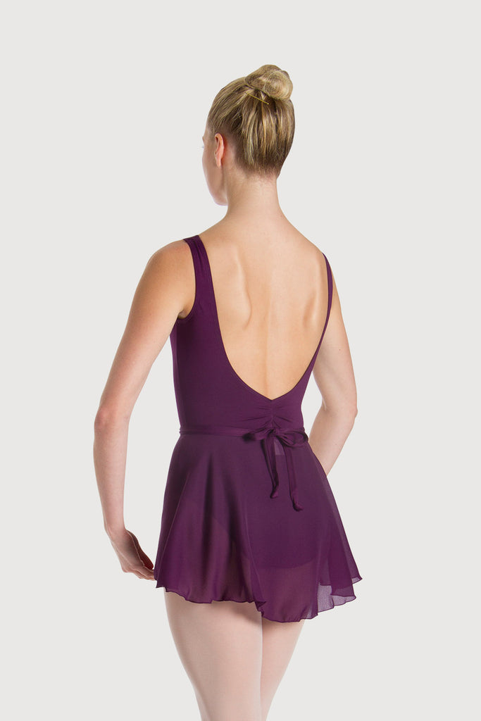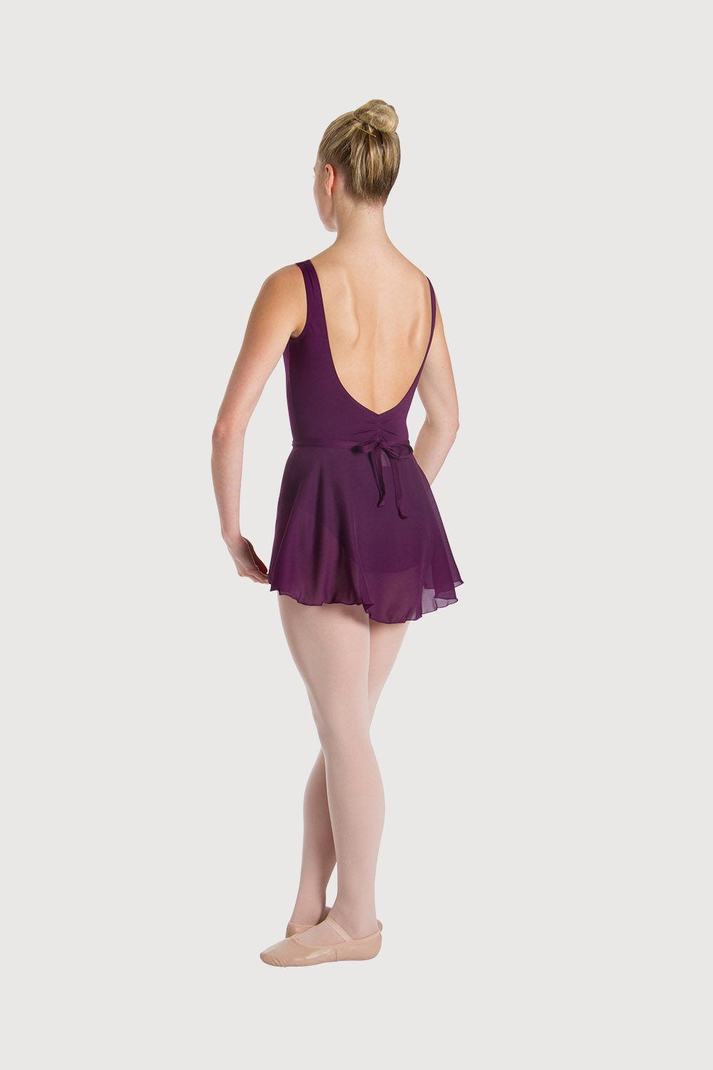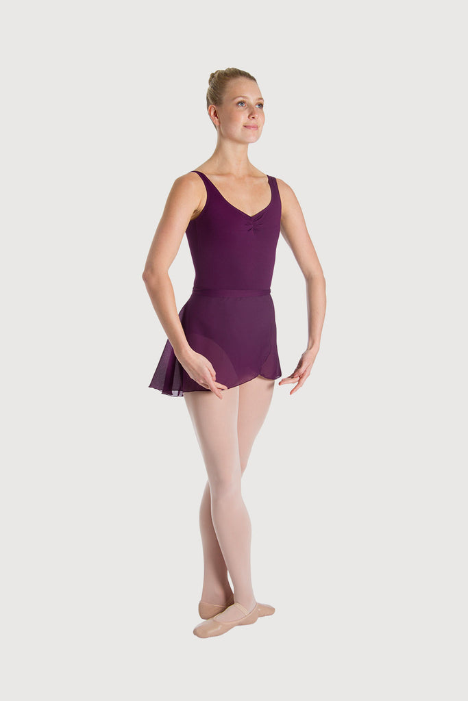 A basic classical style front wrap skirt in a soft georgette material falls in a flattering cross over at the front once tied, finishing in a neat bow in the middle of the back. This short style skirt finishes at the upper thigh and is suitable for both class and examination wear.