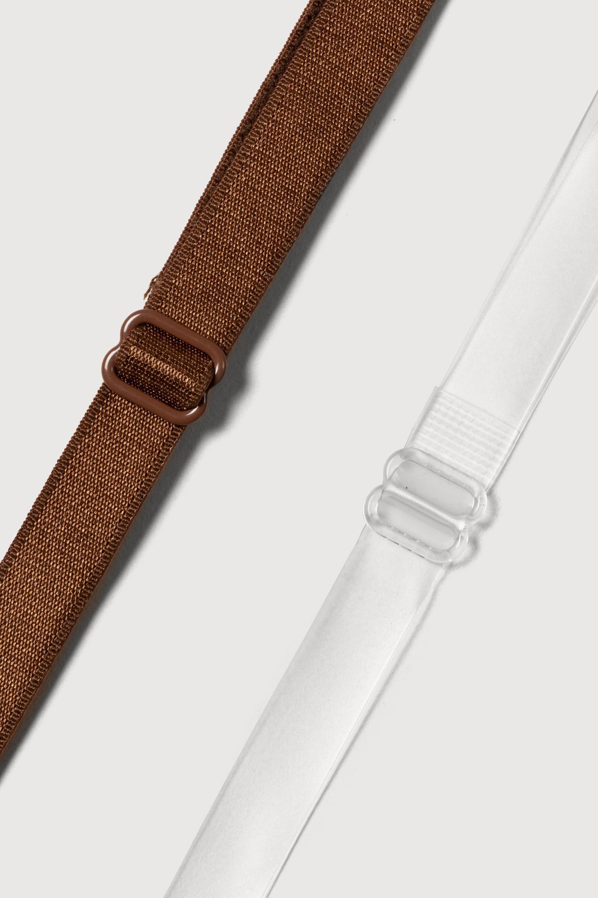 Remove clear straps prior to washing separately, in a cold gentle machine wash. No bleach. Line dry. Cool iron. Do not tumble dry and do not dry clean.