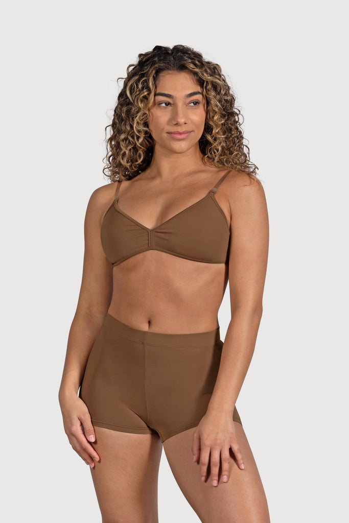 • Cameron is a size 8, 5'5", cup 10E, wears shade Cocoa in Small in the bodyliner and bottoms, size Large in the Bra with cups removed