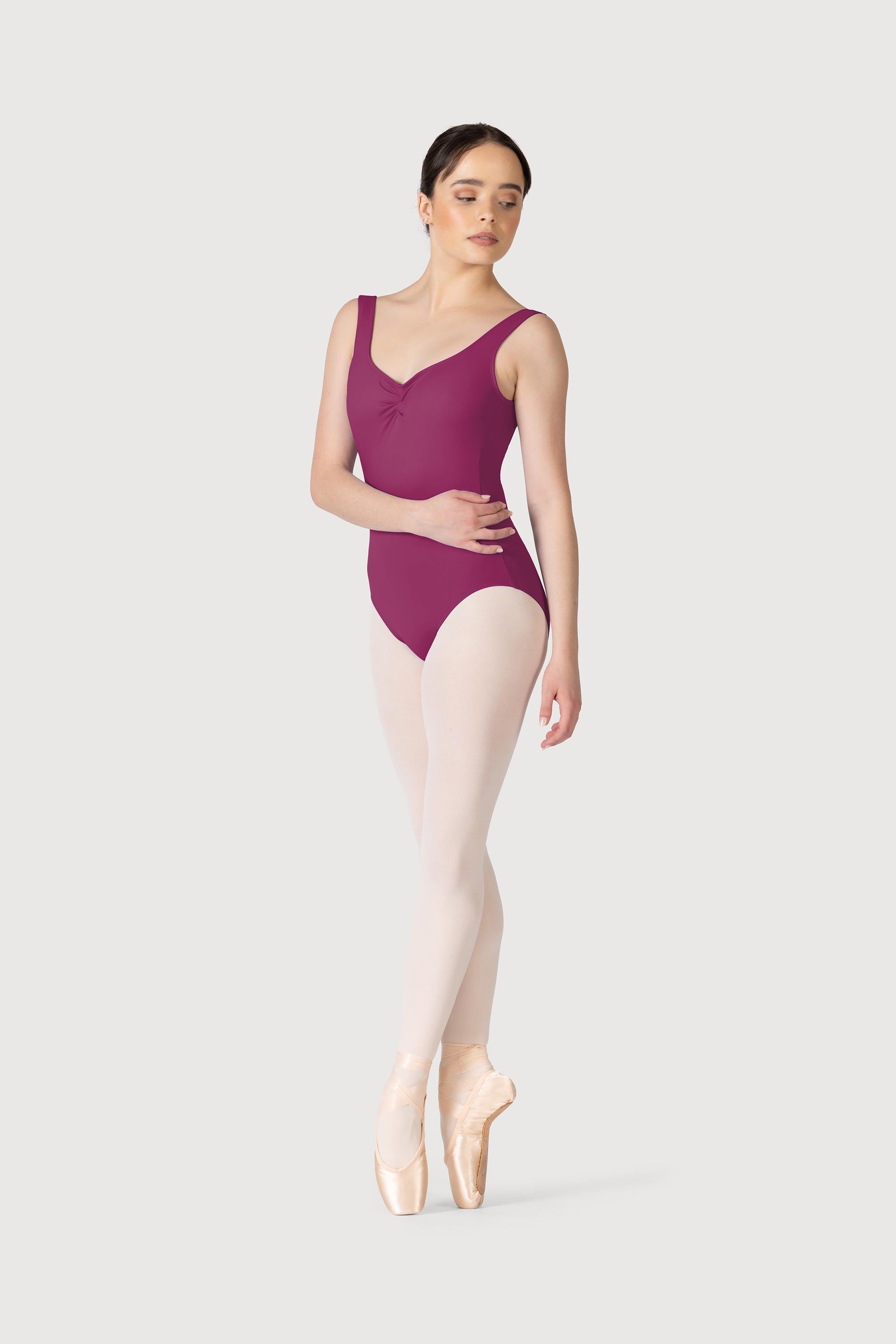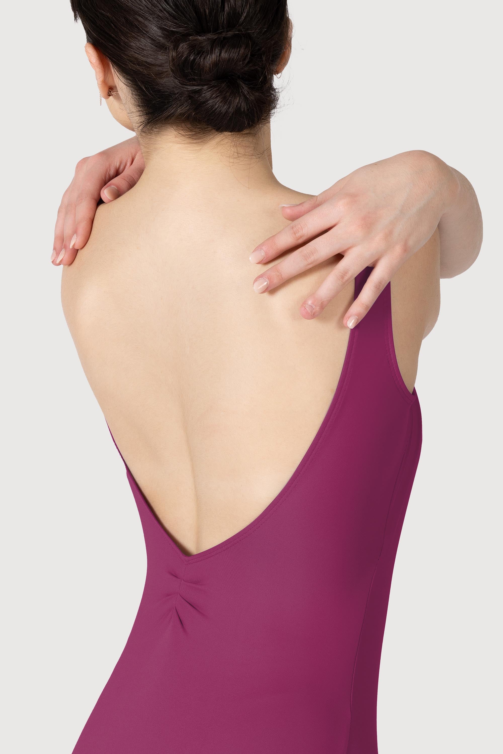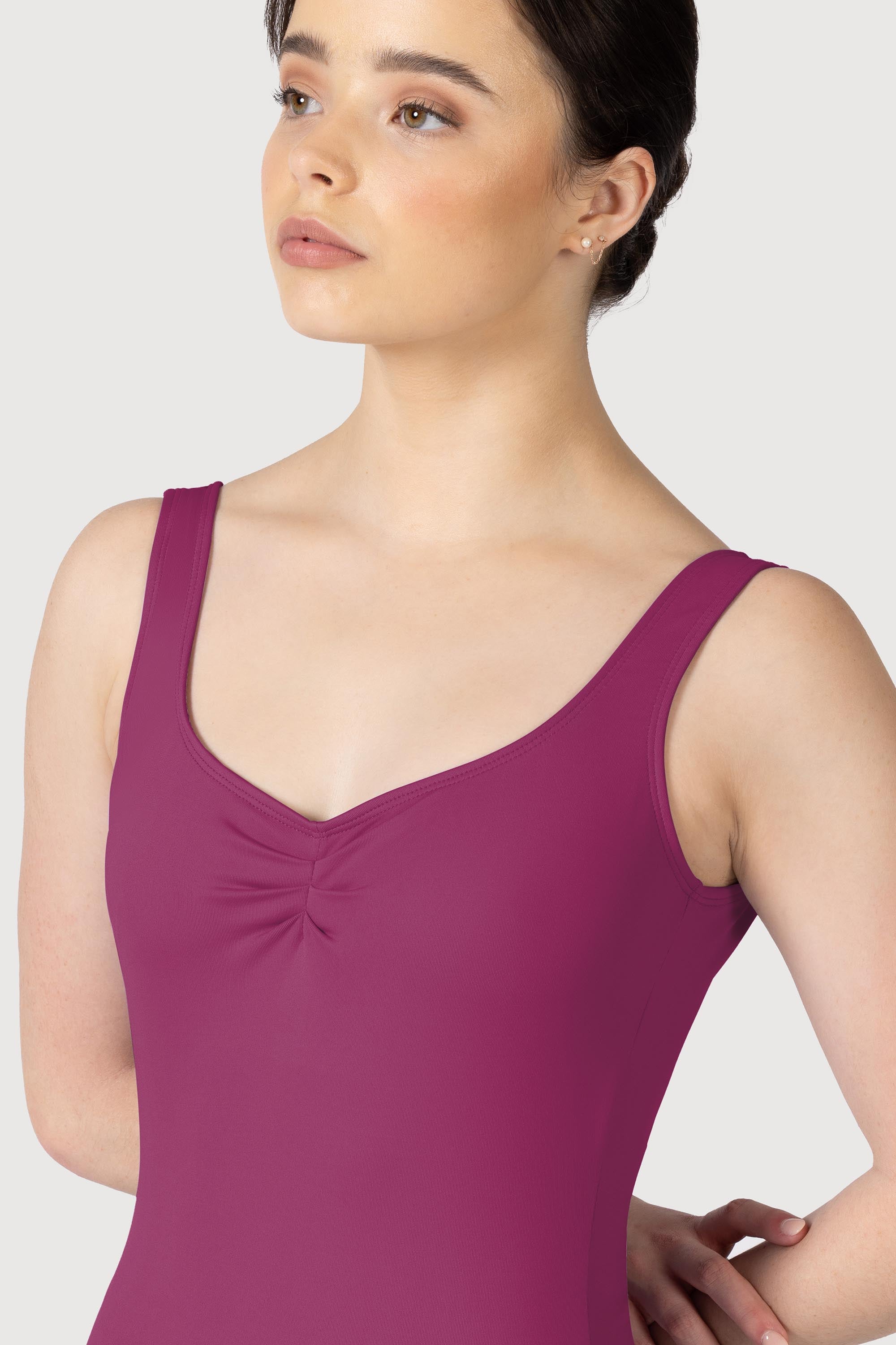 A tank style leotard with a pleated gather front and back is a stunning basic garment that flatters the body with a low line back. The leotard is crafted in our beautiful Microlux™ fabric with it's high performance whicking properties which help to draw moisture away from the body and keep you cool. For a matching skirt we would suggest pairing it with the Bloch Gianna skirt for a complete class outfit.