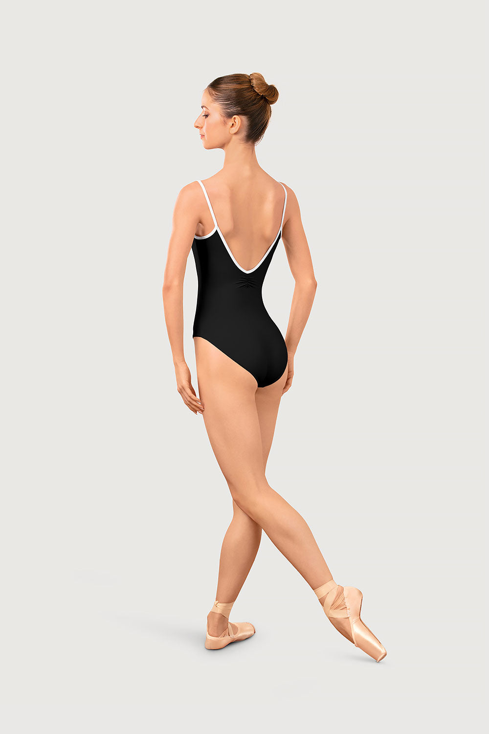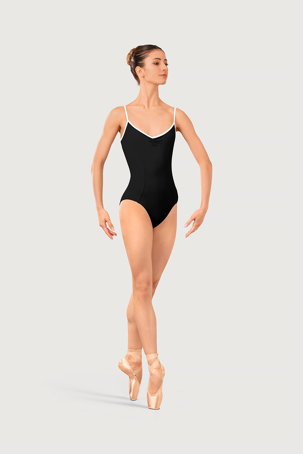 The Arve Leotard combines elegant design with a flattering, sculpted fit. A softly gathered neckline at the front and back shapes the silhouette beautifully, whilst front bodice seams and the high-cut leg pair together to exaggerate the dancer's line. The neckline and camisole strap is finished with a contrast piping that highlights the colour and contour of the design.