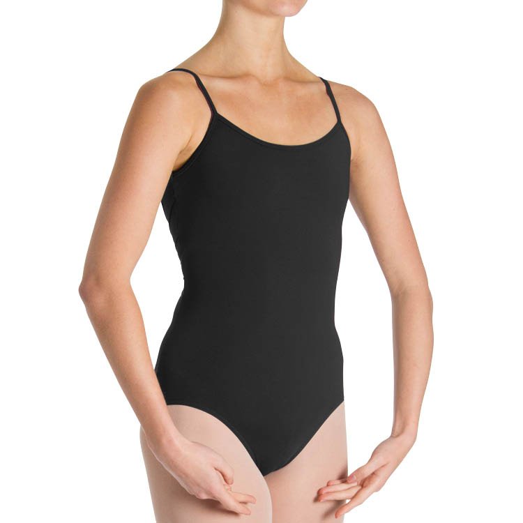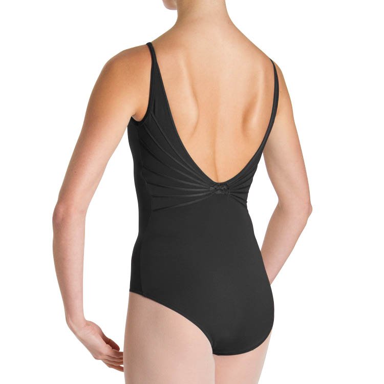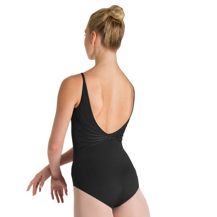 A camisole style leotard with continuous strap has a simple scoop front and features a stunning deep V back with a knotted detail. The line of the leotard draws from the top of the shoulder to the middle of the back into the deep V which flatters the body and gives a beautiful line.