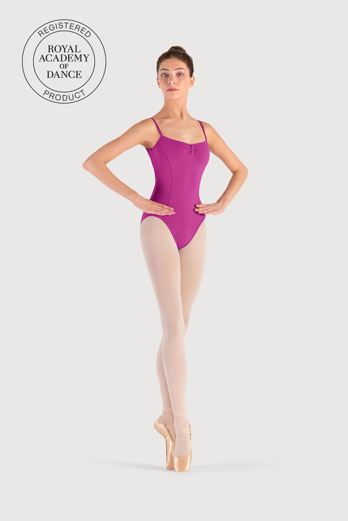 A cami strap style leotard with shaped princess line front seams. The front and low back both have a gathered feature with double tab at the centre. The standard legline flatters all body shapes and the front is lined for modesty and comfort.