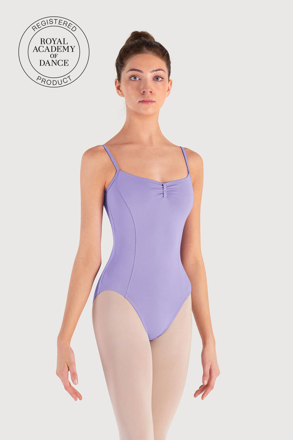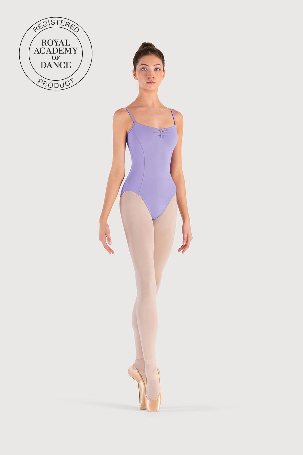 A cami strap style leotard with shaped princess line front seams. The front and low back both have a gathered feature with double tab at the centre. The standard legline flatters all body shapes and the front is lined for modesty and comfort.
