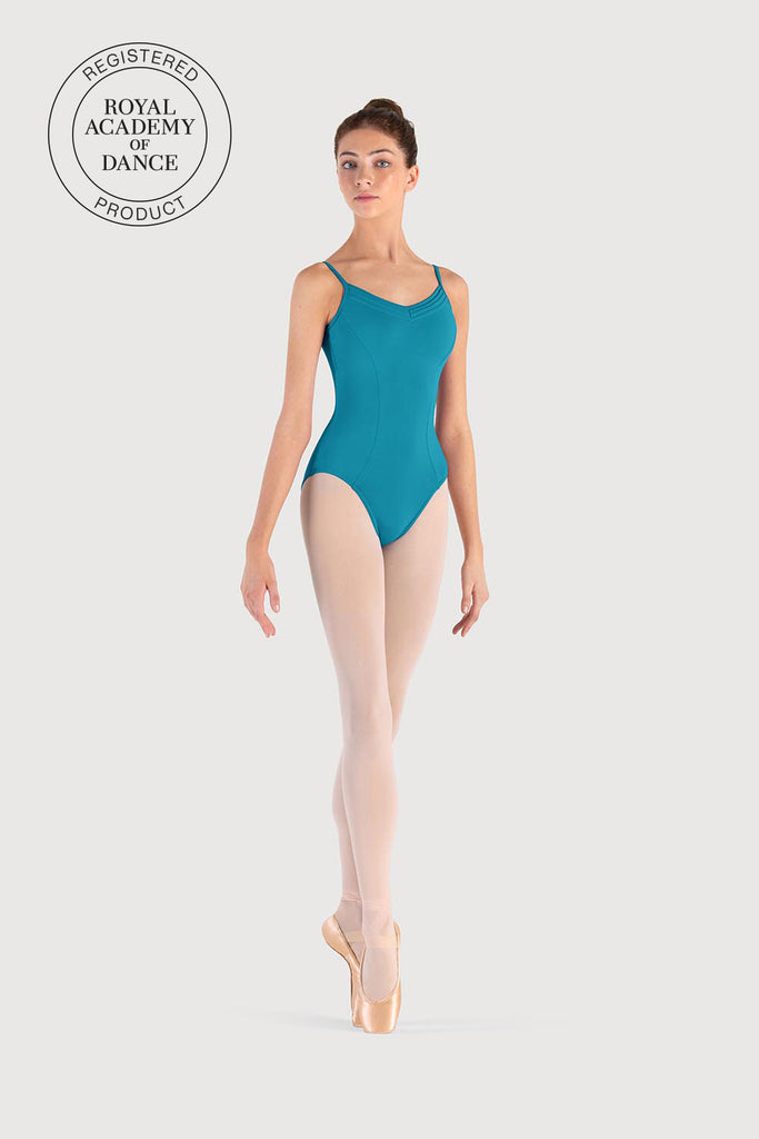 A cami strap style leotard with shaped princess line front seams. The front V neckline features a three pleat design which continues in a pentagon shaped low back. The standard legline flatters all body shapes and the front is lined for modesty and comfort.