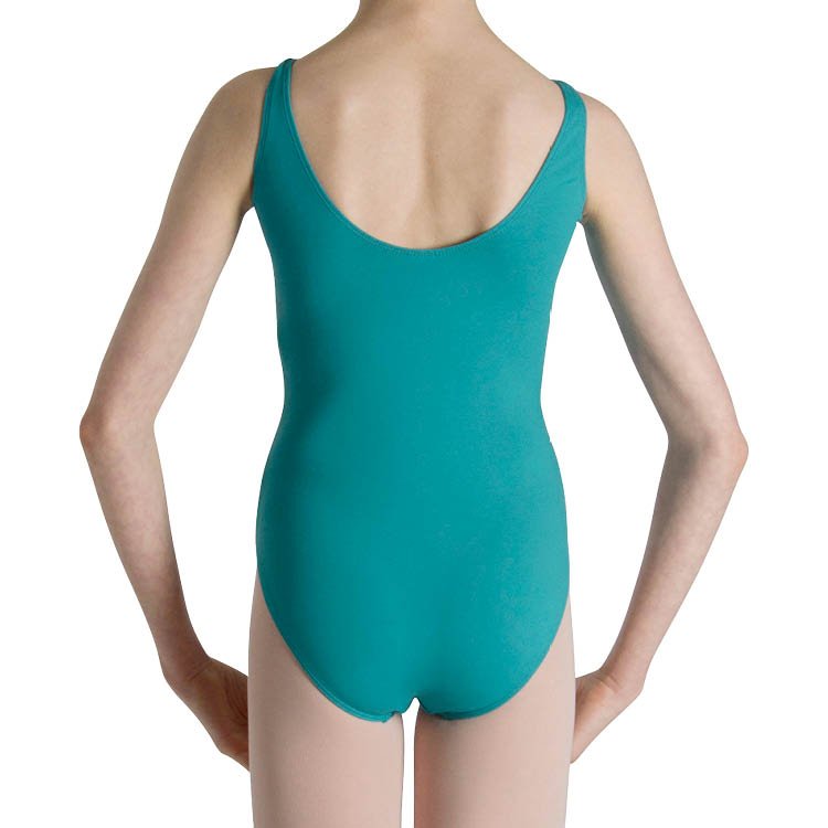 A tank style leotard featuring a gathered front with double tab design. The standard legline flatters all body shapes and the front is lined for modesty and comfort.