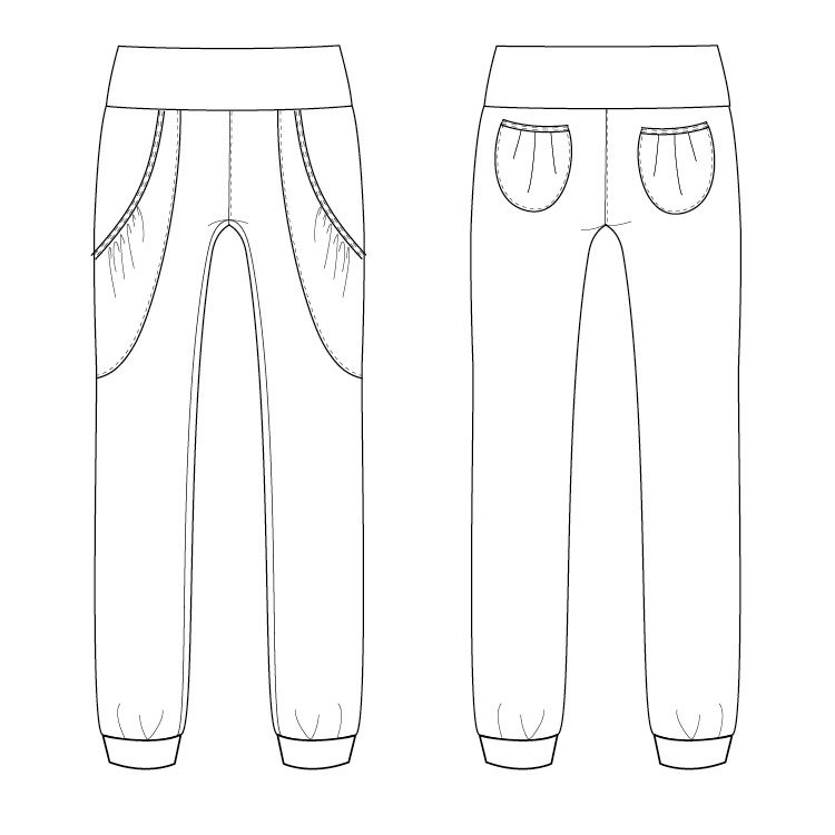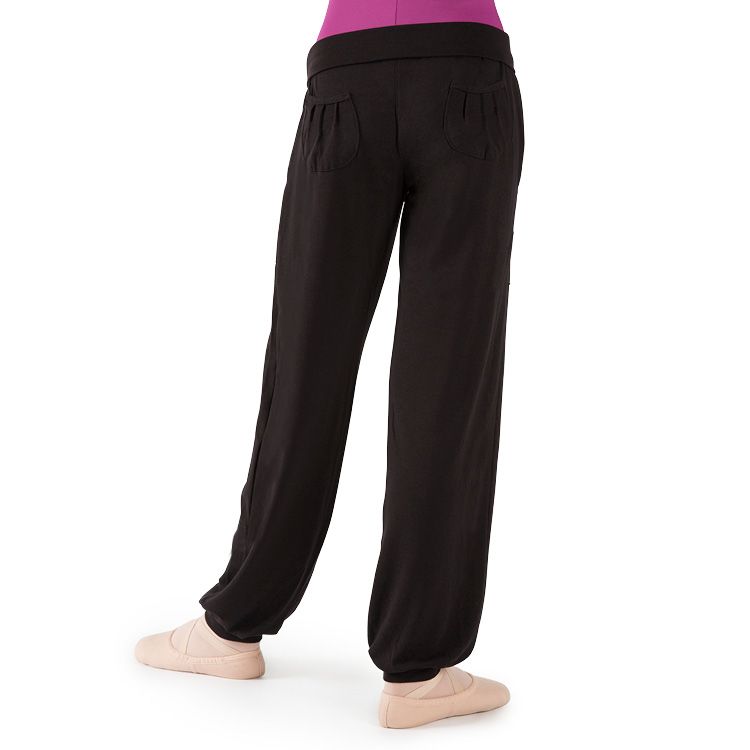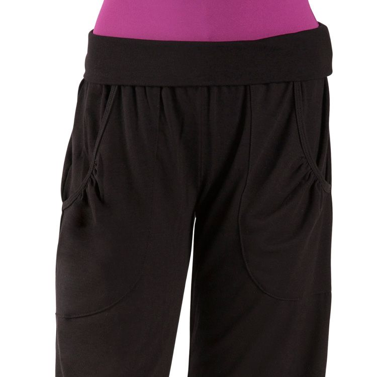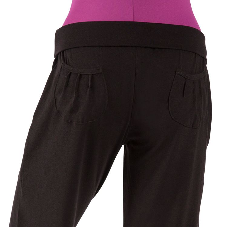 A full-length pant with bottom cuff detail has a wide waistband that can be folded down or worn higher on the tummy. The Harem style of the pant gives a slim lose fit with draped front pockets and small back pockets which are both functional.