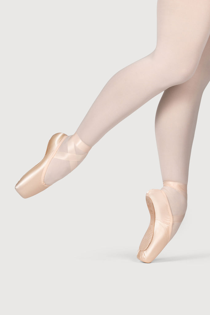 The Synergy pointe shoe gives the dancer the feeling of being elevated up and away from the floor. This shoe holds the foot high and centred giving the dancer stability and the aesthetic appearance of an upside down letter L when 'en pointe'. The high and wide platform with the unique stitching around the box and wings of the Synergy give extra support to the dancer when 'en pointe'. The foot is supported by the many areas of contact inside the box so the metatarsals are held firm and the toes straight. This shoe is best suited to dancers with highly flexible insteps and ankles. The open design of the U shaped vamp enhances the line of the leg.
