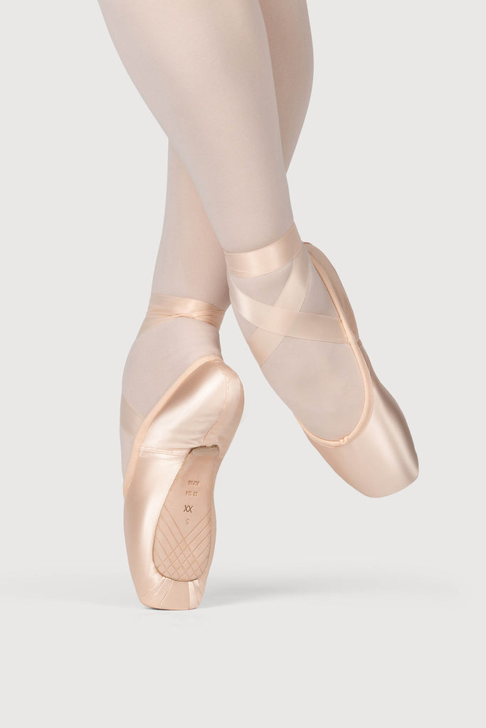 The Alpha pointe shoe is a highly specialized pointe shoe and it is recommended only to be worn by dancers with strong leg and foot muscles. The Alpha pointe shoe suits many foot shapes. The three quarter cut down outsole emphasizes the point of contact under the instep facilitating optimal foot articulation. The shank/insole has been prepared for the dancer to modify to their desired length. We recommend leaving the inner soft leather board for arch comfort. With less resistance from the shank/insole past the break point the dancer will feel well supported and uplifted when 'en pointe'. The long vamp supports the foot by preventing it from over arching. The platform is both wide and high to allow maximum balance when 'en pointe'. The sides of the upper are cut low and the heel contoured. Paste 'B' is used to enable the shoe to mold quickly to the shape of the foot and facilitates articulation.