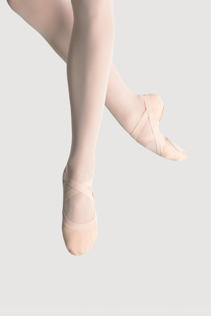 The Synchrony is an innovative design on a split sole ballet flat, developed for interdisciplinary work - lyrical, ballet and gymnastics. The stretch and durable canvas molds to the shape of the foot to ensure a sleek and streamline fit. In place of the binding and cord, the ballet upper has flat elastic that reduces pressure on the Achilles tendon and dorsal surface of the foot on contact with the floor. This eliminates bruising from pressure where the drawstring would otherwise be knotted. For extra stability inside the shoe is a unique inner design of silicone dots on the front and heel pads which maintain the contact grip between the foot and shoe creating a firm marriage between the two. The wide kidney shaped suede outsole front pad shoe allows a wider spread for extra metatarsal comfort and the modified curved heel shape reflects the contour of the heel when pointing. Pre-sewn criss-cross elastic means no sewing is required so the shoes are ready to wear immediately.