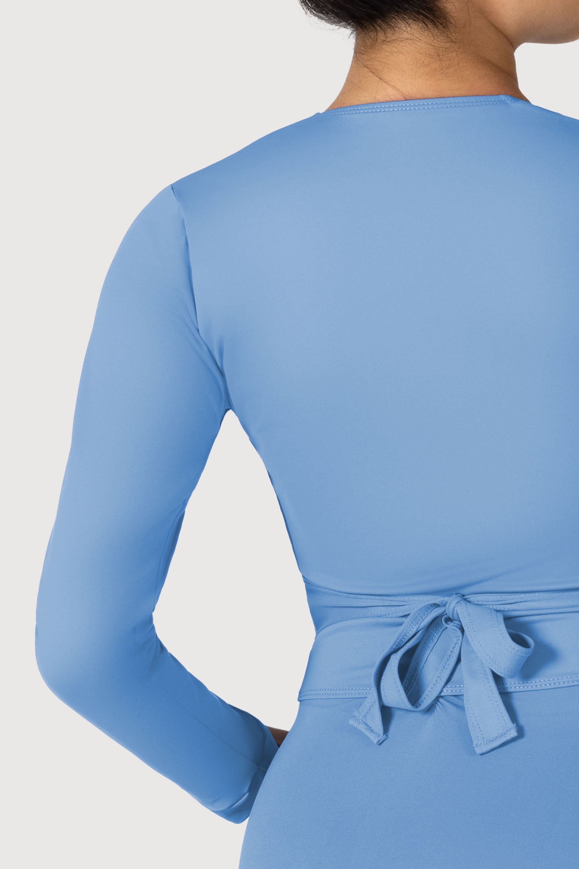 The perfect accompaniment to a ballet outfit is our crossover top, designed with a full length sleeve for added warmth and coverage during the cooler season. The top wraps around the bodice, with a keyhole loop on one side for the tie to be threaded through and easily fastened into a bow at the back.
